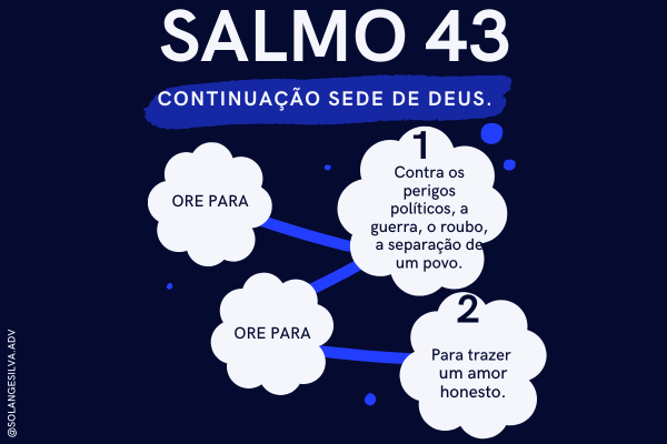 | Salmos, 43 1.Fazei-me justiça, ó Deus, e defendei minha causa contra uma nação ímpia. Livrai-me do homem doloso e perverso, 2.pois vós, ó meu Deus, sois a minha fortaleza; por que me repelis? Por que devo andar triste sob a opressão do inimigo? 3.Lançai sobre mim a vossa luz e fidelidade; que elas me guiem, e me conduzam ao vosso monte santo, aos vossos tabernáculos. 4.E me aproximarei do altar de Deus, do Deus de minha alegria e exultação. E vos louvarei com a cítara, ó Senhor, meu Deus! 5.Por que te deprimes, ó minha alma, e te inquietas dentro de mim? Espera em Deus, porque ainda hei de louvá-lo: ele é minha salvação e meu Deus. |