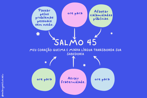 | Salmos, 45 1 Meu coração está compondo sobre um bom assunto. Eu falo das coisas que tenho feito no tocante ao rei; minha língua é a pena de um escritor preparado. 2 Tu és mais belo do que os filhos dos homens, a graça é derramada para dentro de teus lábios; portanto, Deus te abençoou para sempre. 3 Guarda a tua espada sobre tua coxa, ó mais poderoso, com a tua glória e a tua majestade. 4 E na tua majestade cavalga prosperamente por causa da verdade, mansidão e justiça; e a tua mão direita te ensinará coisas terríveis. 5 Tuas flechas são afiadas no coração dos inimigos do rei; por meio das quais os povos caem debaixo de ti. 6 Teu trono, ó Deus, é para sempre e sempre; o cetro do teu reino é um cetro justo. 7 Tu amas a justiça e odeias a perversidade; portanto Deus, teu Deus, te ungiu com o óleo da alegria sobre teus companheiros. 8 Todas as tuas vestimentas cheiram a mirra, aloés e cássia, desde os palácios de marfim, pelos quais te fizeram feliz. 9 As filhas dos reis estiveram entre tuas honoráveis mulheres; sobre a tua mão direita esteve a rainha em ouro de Ofir. 10 Ouve, ó filha, considera e inclina teu ouvido; esquece também teu próprio povo e a casa do teu pai. 11 Então o rei desejará grandemente a tua beleza; porque ele é teu Senhor, e tu, adora-o. 12 E a filha de Tiro estará lá com um presente; até os ricos dentre o povo suplicarão o teu favor. 13 A filha do rei é toda gloriosa por dentro; sua roupa é de ouro forjado. 14 Ela será trazida ao rei em vestes bordadas; as virgens, suas companhias que a seguem, serão trazidas a ti. 15 Com alegria e regozijo elas serão trazidas; elas entrarão no palácio do rei. 16 Ao invés dos teus pais, estarão teus filhos, dos quais tu podes fazer príncipes em toda a terra. 17 Eu farei teu nome ser lembrado em todas as gerações; portanto, os povos te louvarão para sempre e sempre. |