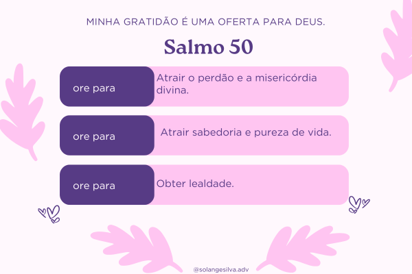 Versículo do dia: “Oferece a Deus ação de graças, e paga os teus votos ao Altíssimo. E invoca-me no dia da angústia; eu te livrarei, e tu me glorificarás.” Salmo 50:14-15