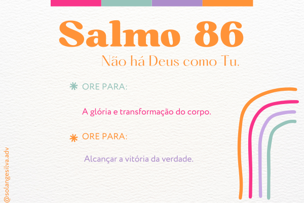 Salmos, 86 (Salmo 85) 1 Inclina o teu ouvido, ó SENHOR, ouve-me, pois eu sou pobre e necessitado. 2 Preserva a minha alma; pois eu sou santo; ó tu, meu Deus, salva o teu servo que confia em ti. 3 Tem misericórdia de mim, ó Senhor, pois eu clamo a ti diariamente. 4 Regozija a alma do teu servo; pois para ti, ó Senhor, elevo a minha alma. 5 Pois tu, Senhor, és bom, e pronto a perdoar; e abundante em misericórdia a todos aqueles que clamam a ti. 6 Dá ouvidos, ó SENHOR, à minha oração; e atende à voz das minhas súplicas. 7 No dia da minha tribulação, eu clamarei a ti; pois tu me responderás. 8 Entre os deuses não há nenhum como tu, ó Senhor, nem há obras como as tuas obras. 9 Todas as nações que tu fizeste virão e adorarão diante de ti, ó Senhor; e glorificarão o teu nome. 10 Pois tu és grande e fazes coisas maravilhosas; somente tu és Deus. 11 Ensina-me o teu caminho, ó SENHOR; eu andarei na tua verdade; une o meu coração para temer o teu nome. 12 Eu te louvarei, ó Senhor meu Deus, com todo o meu coração, e glorificarei o teu nome para sempre. 13 Pois grande é a tua misericórdia para comigo, e tu livraste minha alma do mais baixo inferno. 14 Ó Deus, os orgulhosos se levantam contra mim, e as assembleias de homens violentos buscaram a minha alma, e não te puseram diante deles. 15 Mas tu, ó Senhor, és um Deus cheio de compaixão, e gracioso, longânimo, e abundante em misericórdia e verdade. 16 Ó, torna-te a mim, e tem misericórdia de mim; dá a tua força ao teu servo, e salva o filho da tua serva. 17 Mostra-me um sinal pelo bem; que aqueles que me odeiam possam vê-lo, e fiquem envergonhados, porque tu, SENHOR, me ajudaste e me consolaste. |